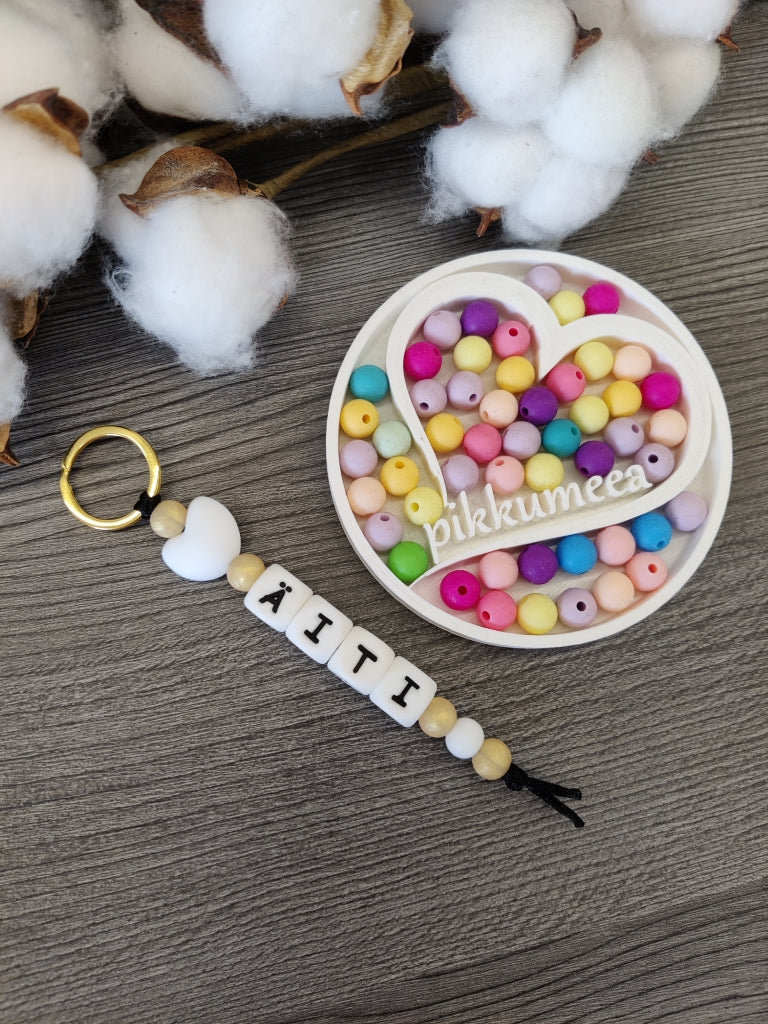Avaimenperässä nauhana satiininauha, johon on pujotettu silikonihelmiä.
