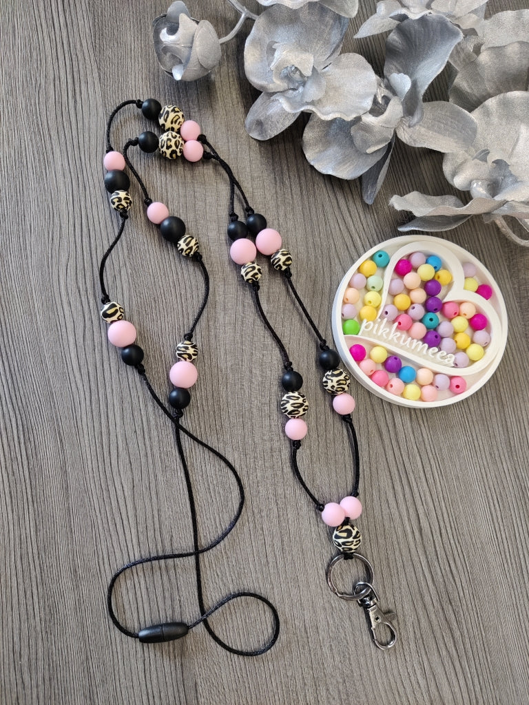 Pikkumeean silikonihelmistä valmistettu olan yli avainnauha (leopardi / vaaleanpunainen / musta) eri pituuksilla. Avainnauha helpottaa arkeasi ja tuo ripauksen persoonallisuutta tyyliisi. Kaikki avainnauhamme ovat 100% suomalaista käsityötä, turvallisista ja laadukkaista materiaaleista.