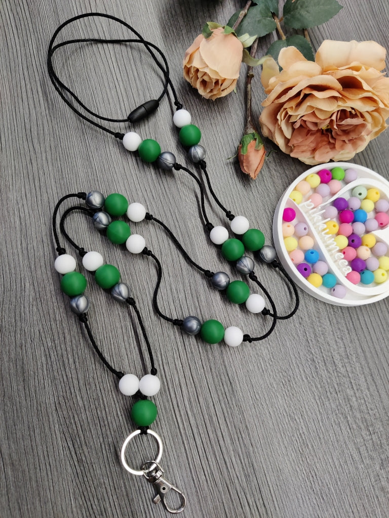 Pikkumeean silikonihelmistä valmistettu olan yli avainnauha (smaragdin vihreä / hopea / valkoinen) eri pituuksilla. Avainnauha helpottaa arkeasi ja tuo ripauksen persoonallisuutta tyyliisi. Kaikki avainnauhamme ovat 100% suomalaista käsityötä, turvallisista ja laadukkaista materiaaleista.