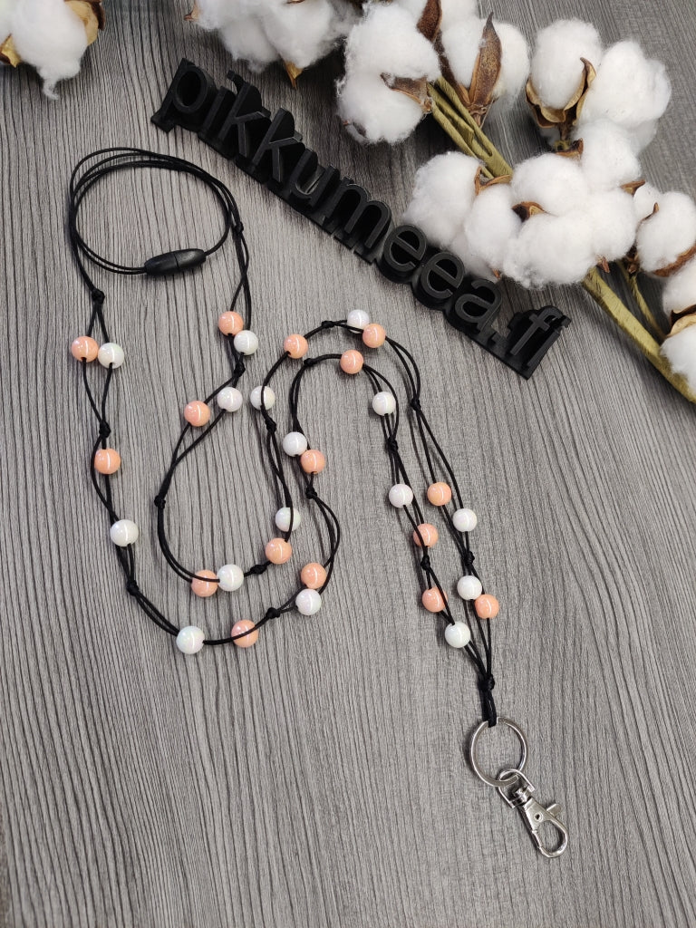 Pikkumeean akryylihelmistä valmistettu olan yli avainnauha (koralli / valkoinen) eri pituuksilla. Avainnauha helpottaa arkeasi ja tuo ripauksen persoonallisuutta tyyliisi. Kaikki avainnauhamme ovat 100% suomalaista käsityötä, turvallisista ja laadukkaista materiaaleista.