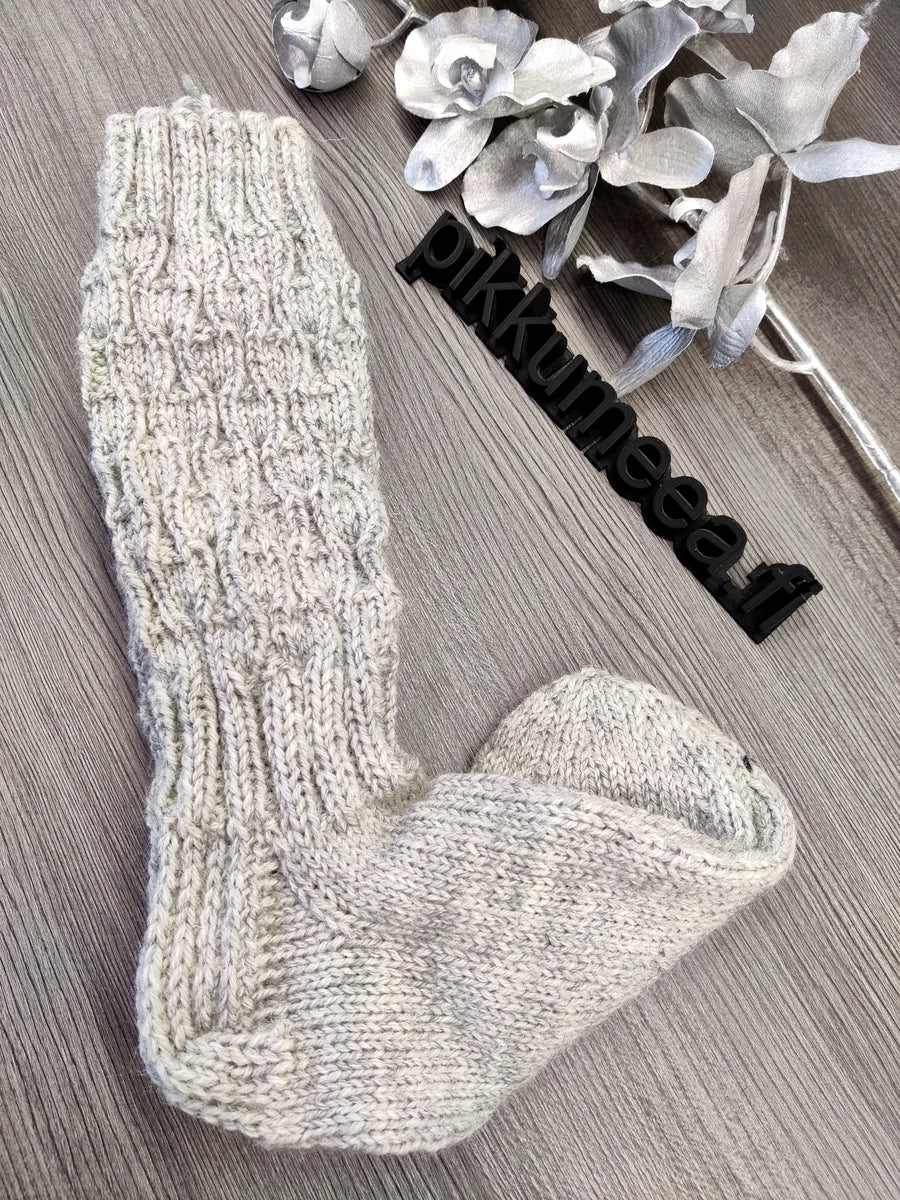Upeat pikkumeean villasukat ovat neulottu huolellisesti rakkaudella 100% korkealaatuisesta vaaleanharmaasta Novitan 7 veljestä langasta.