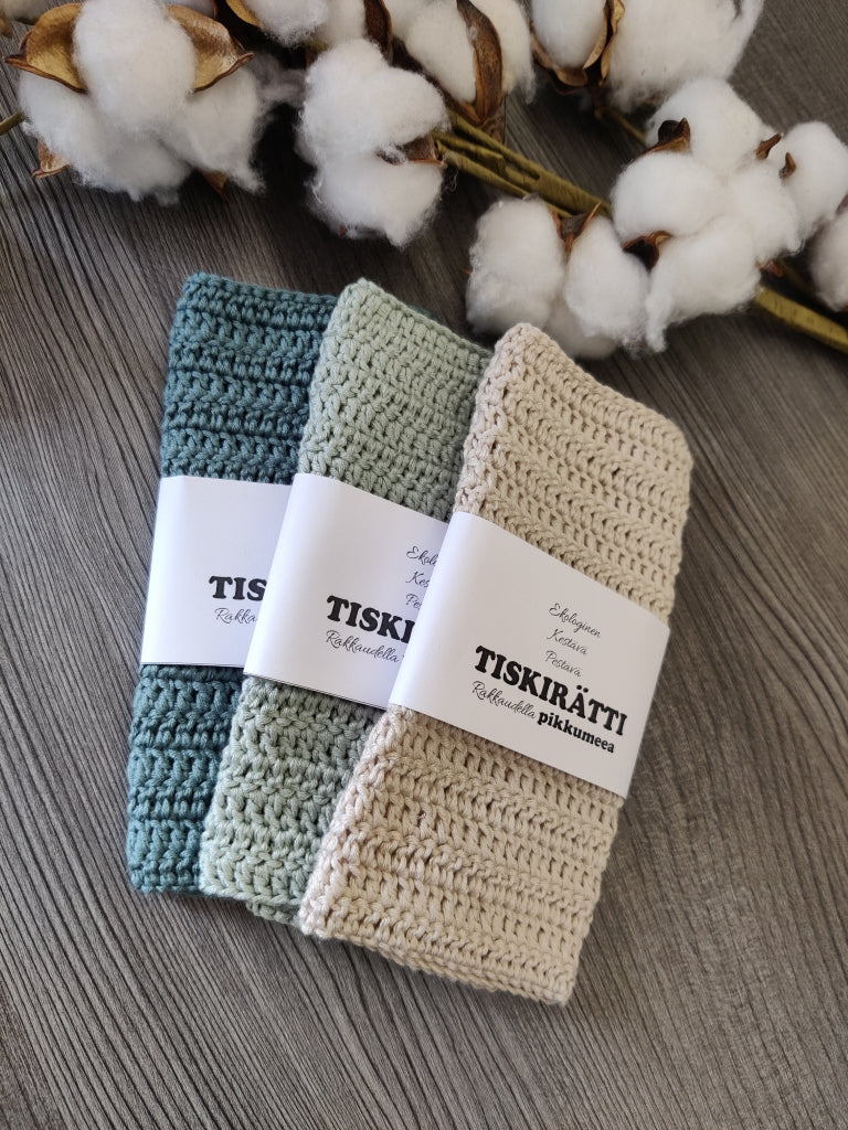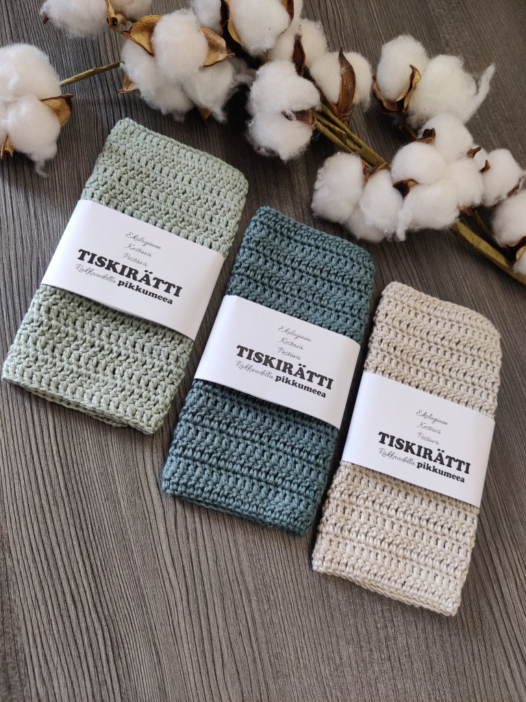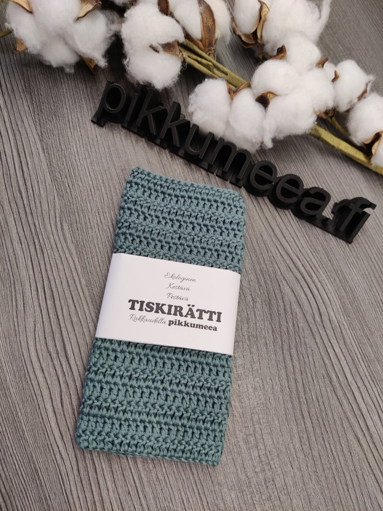 Virkattu tiskirätti on ekologinen valinta. Lankana bambu/puuvilla.